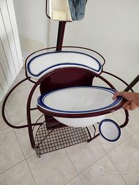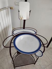Stupendo set da Toilette, composta da una struttura in ferro battuto di colore bordeaux, munita di appoggio per asciugamani, con accessori in ceramica in ottimo stato smaltati di bianco con i bordi blu. Specchio orientabile e sfilabile. Dove viene appoggiata la bacinella ha un sistema di scarico. È stata restaurata con cura.
