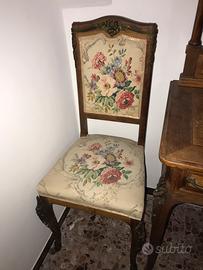 Set da toilette in noce comprendente tre sedie e un mobile specchiera, sedie e poltroncina decorate con tappezzeria a rose, circa anni’30. Il tutto in ottimo stato per l’età (vedere foto). Per foto aggiuntive chiedete pure. Ritiro a mano in zona Roma-Ladispoli.