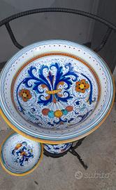 Toilette da camera in ferro battuto comleto di tripiede in ferro, brocca, porta sapone e bacile con una leggera lesione laterale come da foto. Ritiro a mano