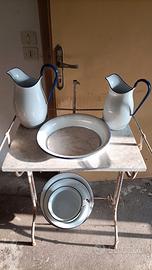 Set da toilette vintage in smalto bianco con bordo blu, composto da due brocche, tre catini ed un vaso da notte, il tutto posizionato su un piccolo tavolino di marmo e ferro battuto, tipico oggetto d'epoca o da collezione.