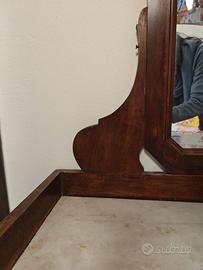 Toilette d'antiquariato (detta anche petineuse), un pezzo classico dell'arredamento da camera da letto risalente al XIX. Piano in marmo bianco di Carrara, specchiera basculante, porta asciugamani laterali, cassetto, gambe tornite ed un piano inferiore di collegamento. Dimensioni: larghezza 104 cm, da aggiungere porta asciugamani 12 cm su due lati. Profondità 58 cm, altezza 136cm.