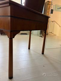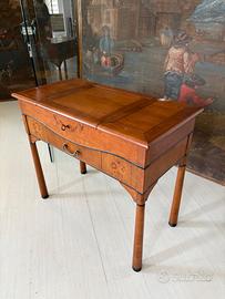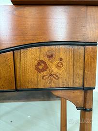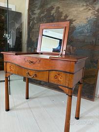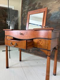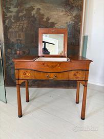 Toilette in legno intarsiato con specchio a scomparsa e dotata di un cassetto centrale.