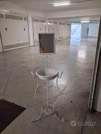 Toilette in ferro battuto pitturata di bianco con catino in ceramica bianca e specchio integro e regolabile.