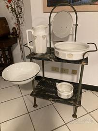 Questo lavatoio-toilette da camera completo di specchio, degli inizi del ‘900, ha una struttura in metallo e ripiani in marmo con un catino estraibile. Completano questo lavatoio-rilette una bacinella, una brocca e un vaso da notte in ceramica con fregi dorati marcati S.C. Richard .