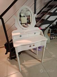Vendo bellissima toilette da trucco bianca originale Maison du Monde (prezzo d'acquisto originario circa 200€). Il mobile è molto elegante, completo di specchio orientabile e tre cassetti con pomelli decorati. Perfetto per arredare la camera con un tocco vintage. Nota sulle condizioni: Il mobile è solido e funzionale, ma segnalo la presenza di alcuni graffi e piccoli segni d'usura sul piano, per questo lo svendo a un prezzo vantaggioso. Ideale anche per un piccolo progetto di restyling. Misure: 70cm x 40 cm. Ritiro a mano ad Appiano Gentile