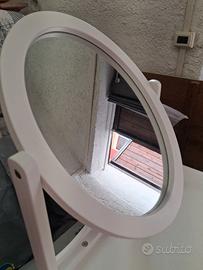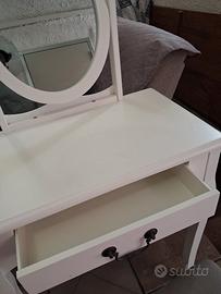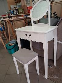 Toilette per trucco in legno laccato bianco opaco, con alcuni piccoli segni di usura, composta da tavolino con specchiera girevole e orientabile, sgabello imbottito in tessuto grigio. Non spedisco causa ingombro. A disposizione per eventuali misure.