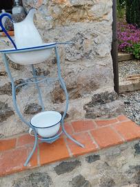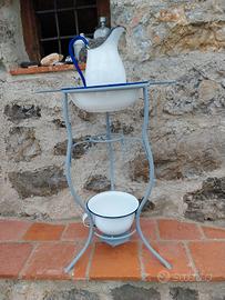 Vendo portacatino (con accessori toilette vintage: catino, brocca, vaso da notte in metallo smaltato) . Trattato con antiruggine, da verniciare a piacimento.