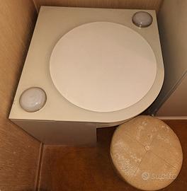 Pezzo unico anni ’60 – Mid-Century Modern Elegante toeletta vintage anni ’60, rara e funzionale anche come scrivania compatta, perfetta per collezionisti e amanti del design mid-century. Funzionalità: Piano ribaltabile con specchio circolare integrato Ampio vano portaoggetti interno Luci originali da trucco (da ricablare), spina anni ’60 Pouf incluso: Diametro 50 cm, altezza 30 cm Pelle originale con naturale invecchiamento e screpolature, colore beige chiaro leggermente sbiadito Finitura e materiali: Superficie con effetto craquelé, tipico anni ’60/'70 Legno dello specchio nella parte bassa con piccole mancanze di lacca e scheggiature Piccola mancanza di lacca nella gamba destra, visibile in foto Condizioni: Buone, con normali segni del tempo Specchio leggermente fuori dal cardine ma si apre e chiude perfettamente Luci integrate da ricablare Dimensioni: Larghezza 80 cm, profondità 80 cm, altezza 70 cm circa Punti di forza: Pezzo unico e raro Elegante e compatto, ideale come toilette o scrivania vintage Consigliato per chi ama pezzi vintage unici: conviene visionarlo di persona Ritiro e pagamento: Solo ritiro a mano, trasporto a carico dell’acquirente Pagamento in contanti Zona: Frattini – Bande Nere, Milano 💡 Nota: originale anni ’60, autentico mid-century. Difetti visibili in foto confermano autenticità e fascino vintage.