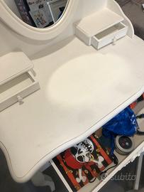 Con il suo specchio regolabile a forma di medaglione, questa toletta in legno sarà l'ideale per fare i capelli o il trucco. Di colore bianco, questa toletta in stile classico è accompagnata da un piccolo sgabello negli stessi toni.
