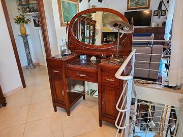 toletta primi '900 con specchio inclinabile, dotata di tre cassetti e due sportelli. piano su tre livelli in marmo. Uno dei marmi è lesionato in un angolo. Già restaurato da professionisti.