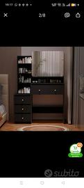 Colore: Nero Stato: Nuova, mai usata. Ha ancora la pellicola protettiva sullo specchio. Vendo bellissima toletta per il trucco causa errore di valutazione delle misure (risulta troppo piccola per le mie necessità). Il mobile è già montato, risparmiandovi ore di lavoro! Caratteristiche principali: Design compatto: Ideale per piccoli spazi o camere da letto. Capienza: 4 cassetti totali + ripiani aperti per profumi e cosmetici. Specchio incluso: Grande e con pellicola ancora applicata. Condizioni: Perfette, nessun segno d'usura. Nota: Non possiedo più la scatola originale. Ritiro: Disponibile per il ritiro a mano presso Verona comune Larghezza: 80 cm Altezza: 128 cm Profondità: 38 cm