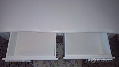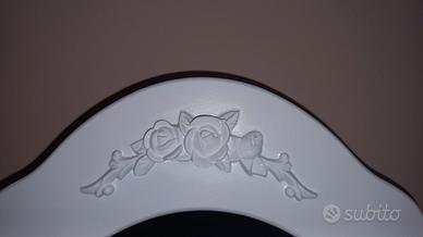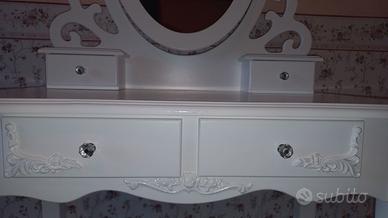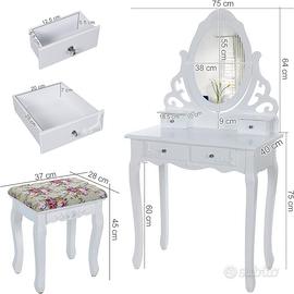 Postazione trucco splendidamente progettato in stile provenzale in legno bianco con specchio compreso di sgabello classico con squisita imbottitura con decorazioni floreali.