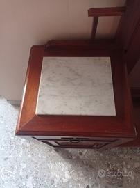 Toletta stile liberty d' epoca, degli inizi del'900. Con specchio regolabile e cassettiera con intagli anteriori e con marmi sulla parte superiore. In legno con maniglie in metallo intagliato. In buonissimo stato, solo qualche graffietto. Vendita di persona.
