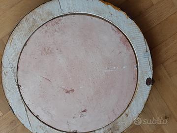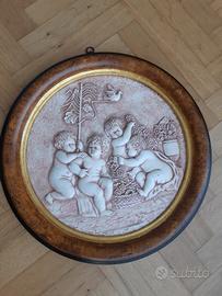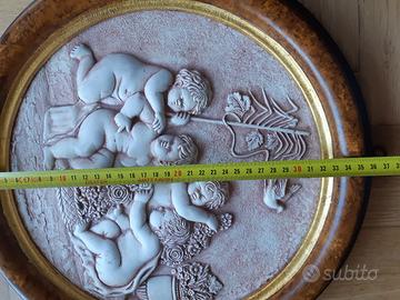 tondo in gesso con puttini in rilievo e cornice di legno. Per una camera romantica.