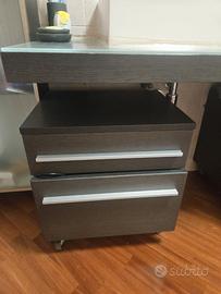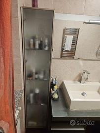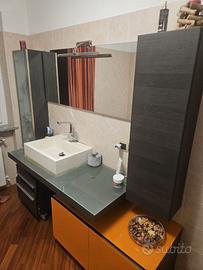 Vendo per cambio casa bagno completo moderno (rifatto 3 anni fa no roba Amazon o Ikea) composto da: 1 Top in legno (ricoperto da vetro) 1 Lavabo rettangolare + rubinetteria Crisitna 1 cassettiera con ruote marrone 1 cassettiera doppia color arancione 1 colonna vetro trasprente 1 colonna legno