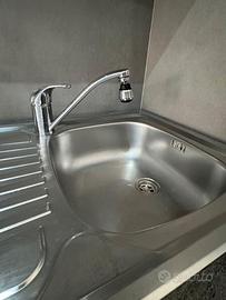 Vendo come da titolo top da cucina in melaminico Grigio effetto pietra L 240cm, P 60cm comprensivo di lavabo a una vasca con gocciolatoio (da 80cm) e miscelatore in acciaio inox, e piano cottura a gas da 5 fuochi. Il top presenta una piccola bruciatura come da foto ma è in generale in ottime condizioni, utilizzato per pochi anni in una seconda casa. Vendo solo con ritiro a mano