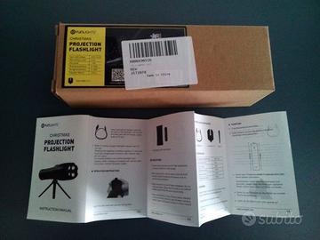 Bellissima torcia a luce bianca a led, marca Yun Lights, con doppia funzione: normale torcia per illuminare al buio ma anche proiettore di immagini colorate di vario tipo: soggetti natalizi, di Halloween, San Valentino, compleanno, festa del ringraziamento.