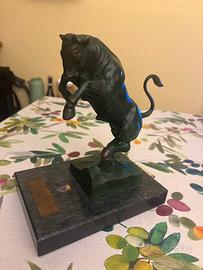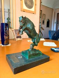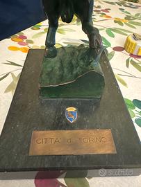 “Toro rampante” realizzato in bronzo e montato su base in marmo nero dive spicca lo stemma e la scritta “Città di Torino”. Riproduzione della celebre scultura di Michelangelo Monti, è alta 25 cm. e pesa 3 Kg. e 490 gr. La base è 20x14