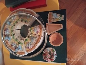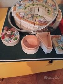 torta con 13 bomboniere in legno e Ceramica? ( o materiale simile) coroncina in metallo per stabilizzare il tutto.