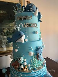 Torta tre piani, scenografica tema marino, decorata in pasta di zucchero.