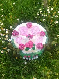 Torta finta in pasta di zucchero, con un dolcissimo angioletto che abbraccia un profumatissimo bouquet