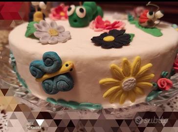 Vendo finta torta in pasta di zucchero da appoggiare su una vera torta, anche semplicemente di panna, ed avere l'effetto scenografico di una torta a piani. Diametro cm 20