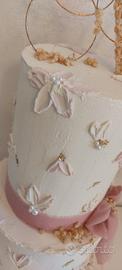 torta in stucco bianco con decori in rosa antico e fiori bianchi con iniziale. altezza 43 cm circa più l'iniziale