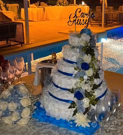 Torta nunziale di petali bianchi con fiori bianchi e blu cristalli e perle