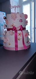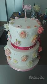 Torta finta per allestimento tavolo femminuccia. In polistirolo, stuccata, con fiori finti. Bellissima come in foto