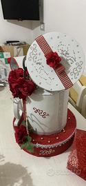 Vendo torta scenografica realizzata a mano.18anni .Tema amore /rose rosse.La lettera applicata (La D )si puo’togliere Compreso cuore per tavolo della festeggiata e 6 vasetti a forma di cuore decorati con roselline da mettere lungo i tavoli fegli invitati.Di grande effetto.Consegna s Roma la rustica o Ponte Mammolo metro o spedisco con subito
