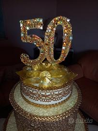 Vendo a malincuore , ma tenerla non serve a nulla. Torta scenografica per il 50 anniversario e può essere anche per un 50 compleanno. Realizzata con swarosky e gocce di cristalli. intarsiata a mano . pezzo unico a 4 piani. Eslclusa la parte finale con i fiori perche era del ristorante.Vendo a 50 euro solo per recupero spese materiale. non meno di questo prezzo.
