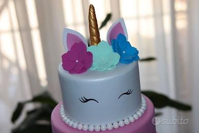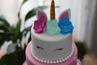 Torta scenografica a tre piani per compleanno tema unicorno con fiori.