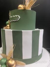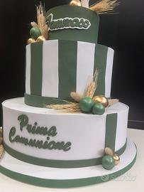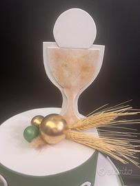 Torta scenografica per Prima Comunione, colore bianco e verde. Circonferenza:40 cm * 37 di altezza ( calice escluso). Molto semplice ma d’effetto, con spighe vere.
