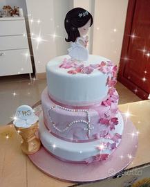 Vendo torta scenografica per Prima Comunione, tre piani in polisterolo rivestiti in pasta di zucchero. Se siamo in zona c'è anche la possibilità di affittarla.