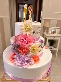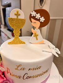 Torta scenografica prima comunione, ma puó essere usata per qualsiasi evento. Scritte rimovibili. Ricoperta in gomma EVA. Misure Alta circa 30cm (40 cm comprese le statuine), circonferenza della base 35cm.