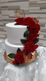 vendo torta scenografica bianca con rose rosse effetto Velluto. usata una volta solo x foto. in perfette conduzioni. basi 30x15 e 25x15