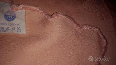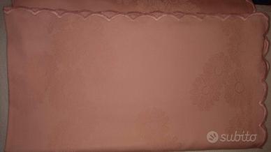 Idea regalo. Bellissima tovaglia damascata rosa perfetta per un regalo o per la tavola dei giorni di festa. 100% cotone. MAI USATA. Misure 225 x 175 cm circa. Con 8 tovaglioli 40x40cm.