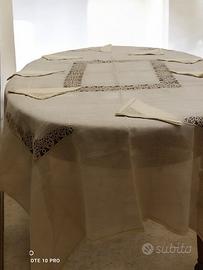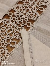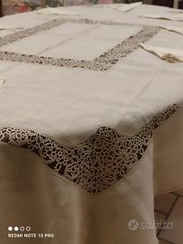 Tovaglia in lino sottilissimo rettangolare da 8 con tovaglioli,mis 180x230 con applicazione di tombolo eseguito mano