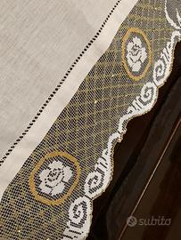 Effettuo applicazione del lino alla balza per completare la tovaglia, con sfilatura gigliuccio, zig zag, ecc…