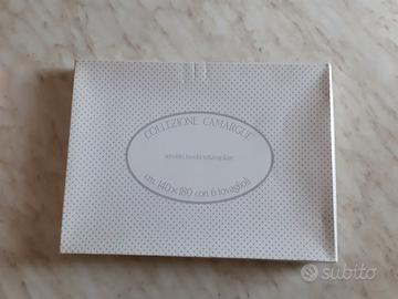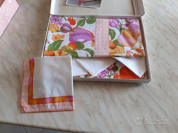 Tovaglia anni 80 Collezione Camargue rettangolare 140 x 180 con 6 tovaglioli. Nuovissima, sempre rimasta nella sua scatola in un armadio.