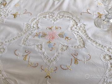 Splendida tovaglia vintage d'altissima qualità, pezzo autentico proveniente da corredo di famiglia. Il capo è interamente ricamato a mano con raffinatissime cuciture a foto (punto giorno e intaglio).