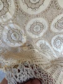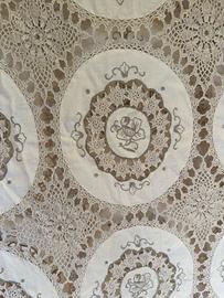 Vendo magnifica tovaglia antica di grandi dimensioni, un vero capolavoro di artigianato tradizionale. Perfetta per arricchire una sala da pranzo elegante o per occasioni speciali, dona un tocco di classe senza tempo all'ambiente. L'intera tovaglia è frutto di un lungo e minuzioso lavoro manuale, tipico dei preziosi corredi di una volta. Presenta grandi medaglioni in tessuto liscio con delicati ricami a motivo floreale (color corda/taupe), uniti magistralmente da una fittissima e complessa rete in pizzo lavorata interamente all'uncinetto.