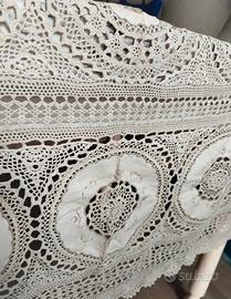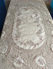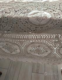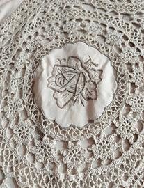 Bellissima tovaglia antica, realizzata in lino. Presenta un delicato ricamo a rose e pizzo. Perfetta per un arredamento classico ed elegante.