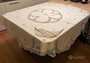 Tovaglia antica in lino, con ricamo a tombolo, per 8 posti, adatta per le feste.
