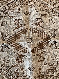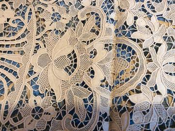 Regalatevi il fascino senza tempo di un’arte tessile raffinata con questa splendida tovaglia antica interamente lavorata a mano in pizzo.