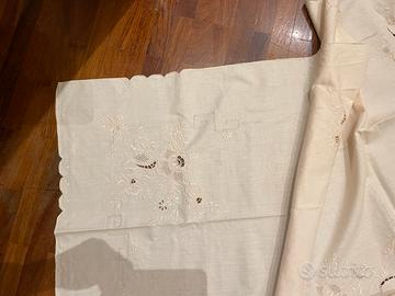Vendo tovaglia ricamata interamente a mano ad intarsio, cm 250x170, e n. 8 tovaglioli cm 40x40 anche questi con ticamo ad intarsio, bellissimo colore beige.