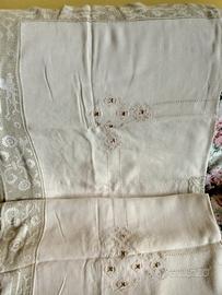 Tovaglia 12 coperti tono su tono ricamata a mano con inserti e bordo in filet usata una sola volta, completa di 12 tovaglioli anch'essi ricamati a mano.