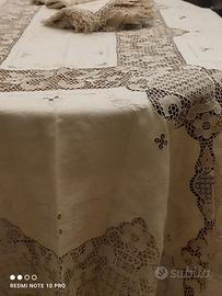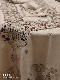 Tovaglia rettangolare da 12 con tovaglioli ricamata a mano con pizzo burano,mai usata.170x280.Puro lino