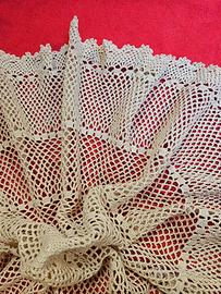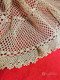 Elegante tovaglia per tavolino da bar, o centrotavola grande con diametro 80cm, vintage, realizzata a mano a l'uncinetto. Un pezzo unico che aggiunge un tocco di classe alla tua casa. Motivo a rete traforato, bordatura decorativa, design circolare, in ottime condizioni da come si vede dalle foto. Un vero gioiello anche per ii collezionisti o amanti del retrò. Le foto sono parte integrante della descrizione.