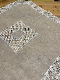 Tovaglia centrotavola in lino grezzo e ricami a mano eseguito con tecnica sfilato . Misura cm 80xcm80, mai usata